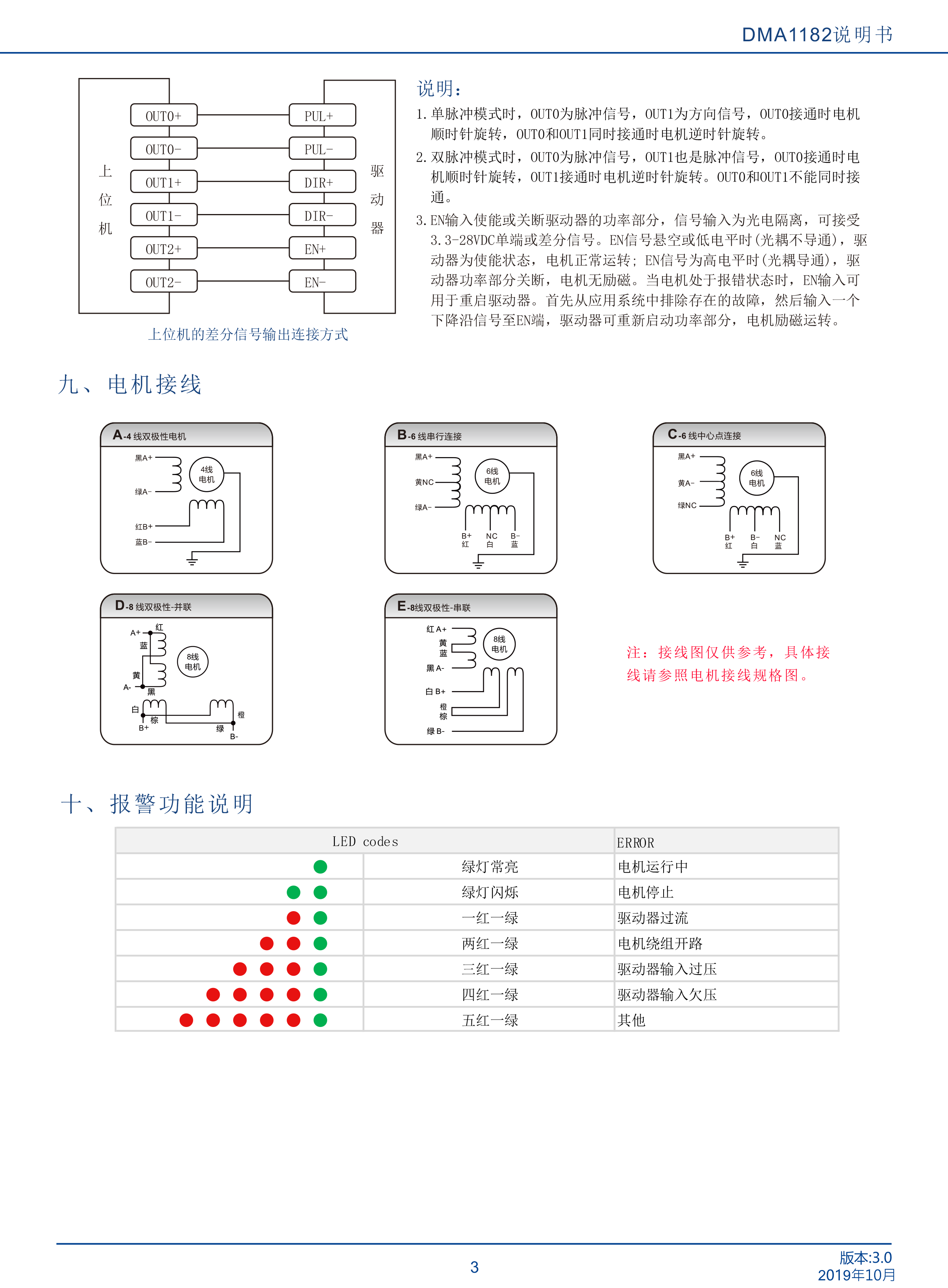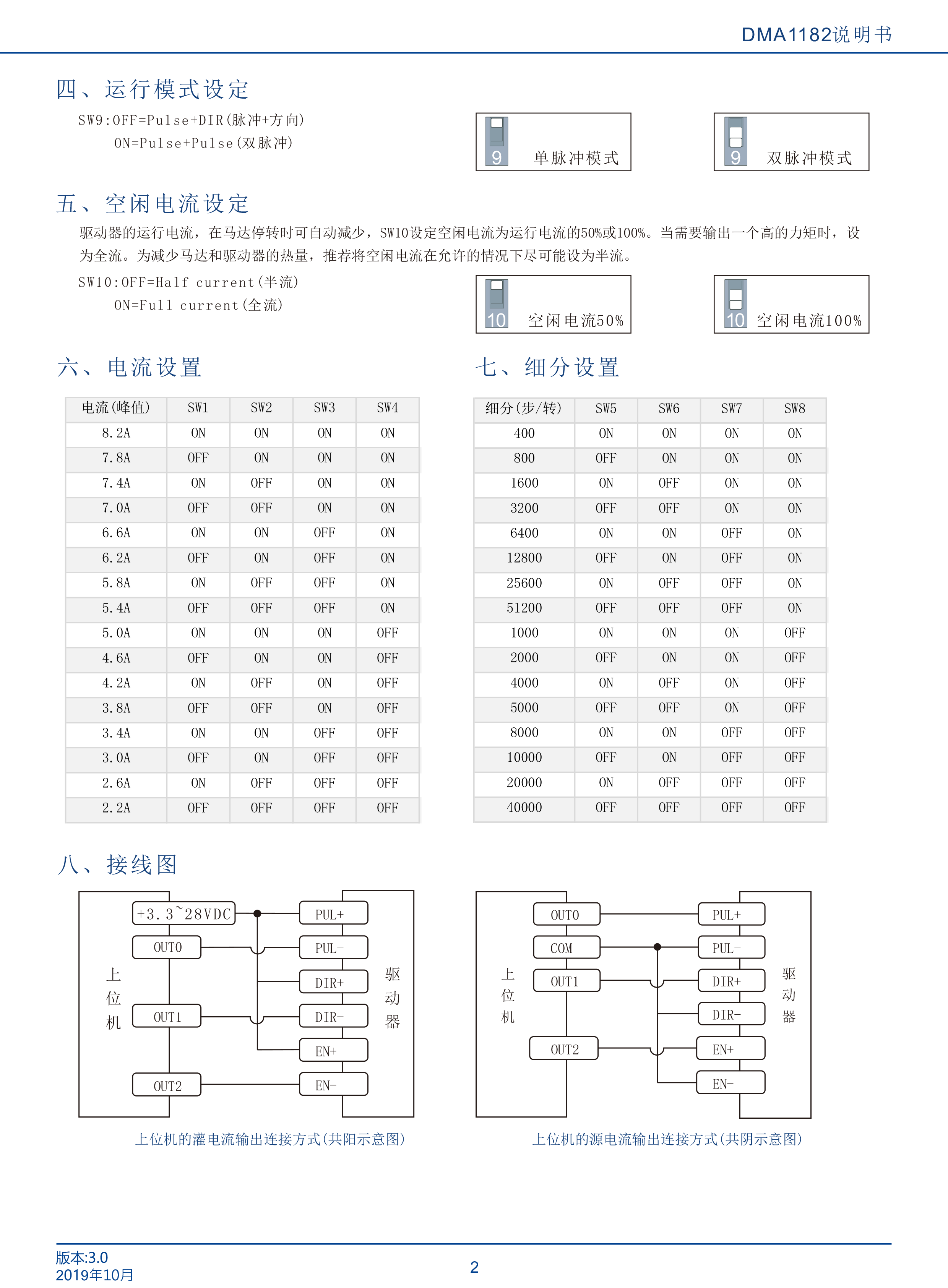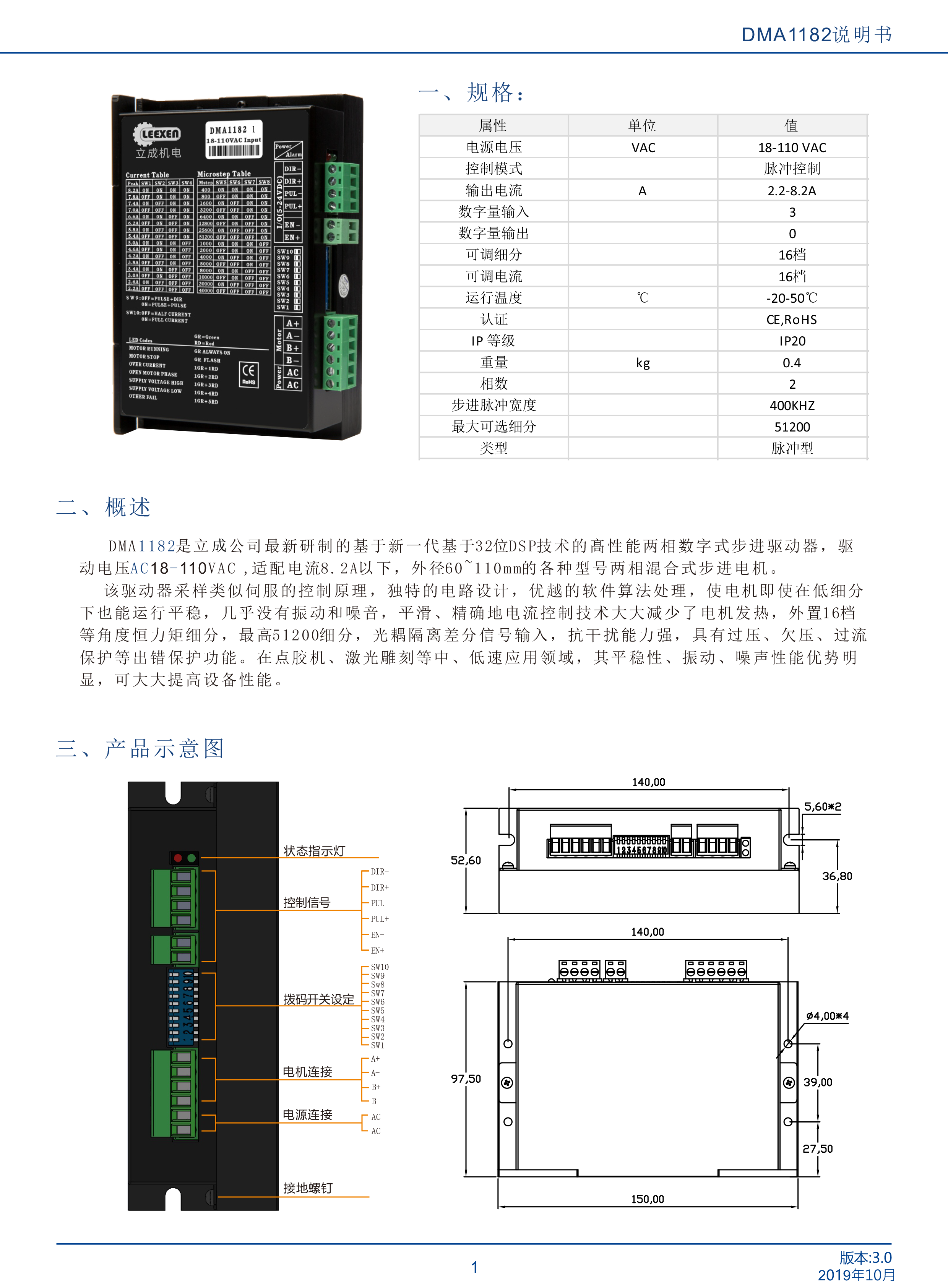 DMA1182是立成公司最新研制的基于新一代基于32位DSP技術(shù)的高性能兩相數(shù)字式步進(jìn)驅(qū)動器,驅(qū)動電壓AC18-110VAC,適配電流8.2A以下,外徑60 110mm的各種型號兩相混合式步進(jìn)電機(jī)。該驅(qū)動器采樣類似伺服的控制原理,獨(dú)特的電路設(shè)計(jì),優(yōu)越的軟件算法處理,使電機(jī)即使在低細(xì)分下也能運(yùn)行平穩(wěn),幾乎沒有振動和噪音,平滑、精確地電流控制技術(shù)大大減少了電機(jī)發(fā)熱,外置16檔等角度恒力矩細(xì)分,最高51200細(xì)分,光耦隔離差分信號輸入,抗干擾能力強(qiáng),具有過壓、欠壓、過流保護(hù)等出錯(cuò)保護(hù)功能。在點(diǎn)膠機(jī)、激光雕刻等中、低速應(yīng)用領(lǐng)域,其平穩(wěn)性、振動、噪聲性能優(yōu)勢明顯,可大大提高設(shè)備性能。