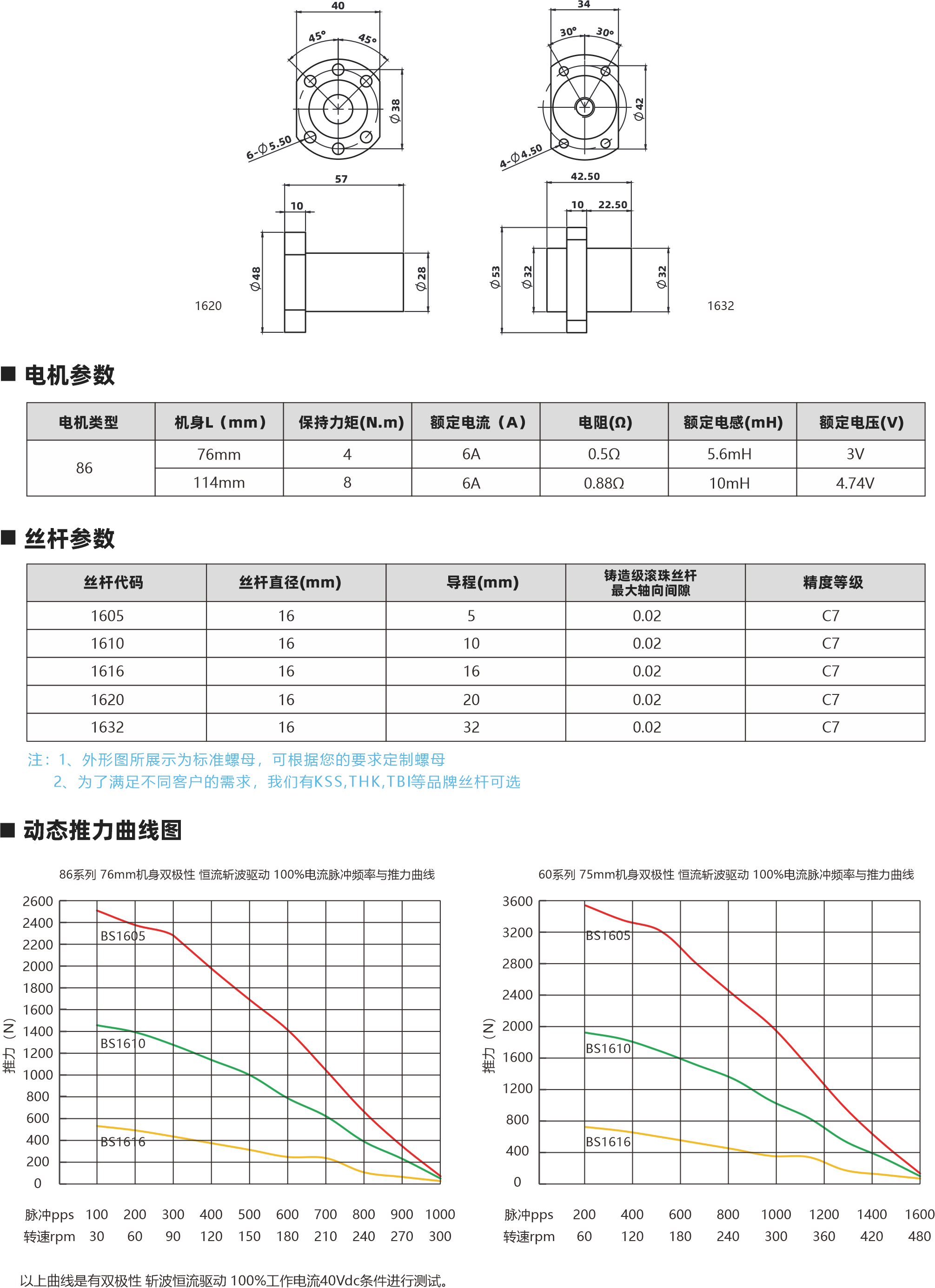 86系列滾珠絲桿電機 相數(shù) 步距角精度 IP等級 認證 絕緣等級 運行環(huán)境溫度 0 土5% 40 ROHS CE ISO9001 B( 130C) -20C- +50C 外形圖 69.6 4 J 5m ELo 02+005 螺母外形圖 60 配西 6 C0 50 1510 1621 1532 電機參數(shù) 電機類型 86 機身L(mm) 76mm 11 4mm 保持力矩(N.m) 額定電流(A] 64 64 電阻(Q] 0.50 0.880 額定電感(mH) 5.6mH 10mH 額定電壓IV) 3V 4.74V 絲桿參數(shù) 絲桿代碼 1605 1610 1616 1620 1632 絲桿直徑(mm) 16 16 16 分 16 導程(mm) 5 10 16 20 32 鑄適級滾珠絲桿最大軸向間陳 0.02 0.02 0邪伴毖2 0.02 0.02 精度等級 C7 C7 C7 0 C7 注: 1、外形圖所展示為標準螺母,可根據(jù)您的要求定制螺母 2、為了滿足不同客戶的需求,我們有KSS,THK,TBI等品牌絲桿可選 動態(tài)推力曲線圖 86系列 76mm機身雙極性 屆流新法這動 100%電流練沖數(shù)平與推力曲錢 2600240022002000180016001400120070008006004000 (N)長料 351670 240 270 300 wtpps 100 200 300 400 500 600 700 800 900 1000 專電rpm 30  60  90 120 150 180 210 0系列 75mm機身雙極性 信在新被這動 100%電流隊沖頻平與推力曲法 3600 320028002400200076007200800400O 脈沖pps轉(zhuǎn)迪rppm 851605 351610 351616 20060 400120 600 180 800 1000 1200 1400 240 300 360 420 1600480 以上曲線是有雙極性 斬波恒流驅(qū)動 100%工作電流40Vd親件進行測試